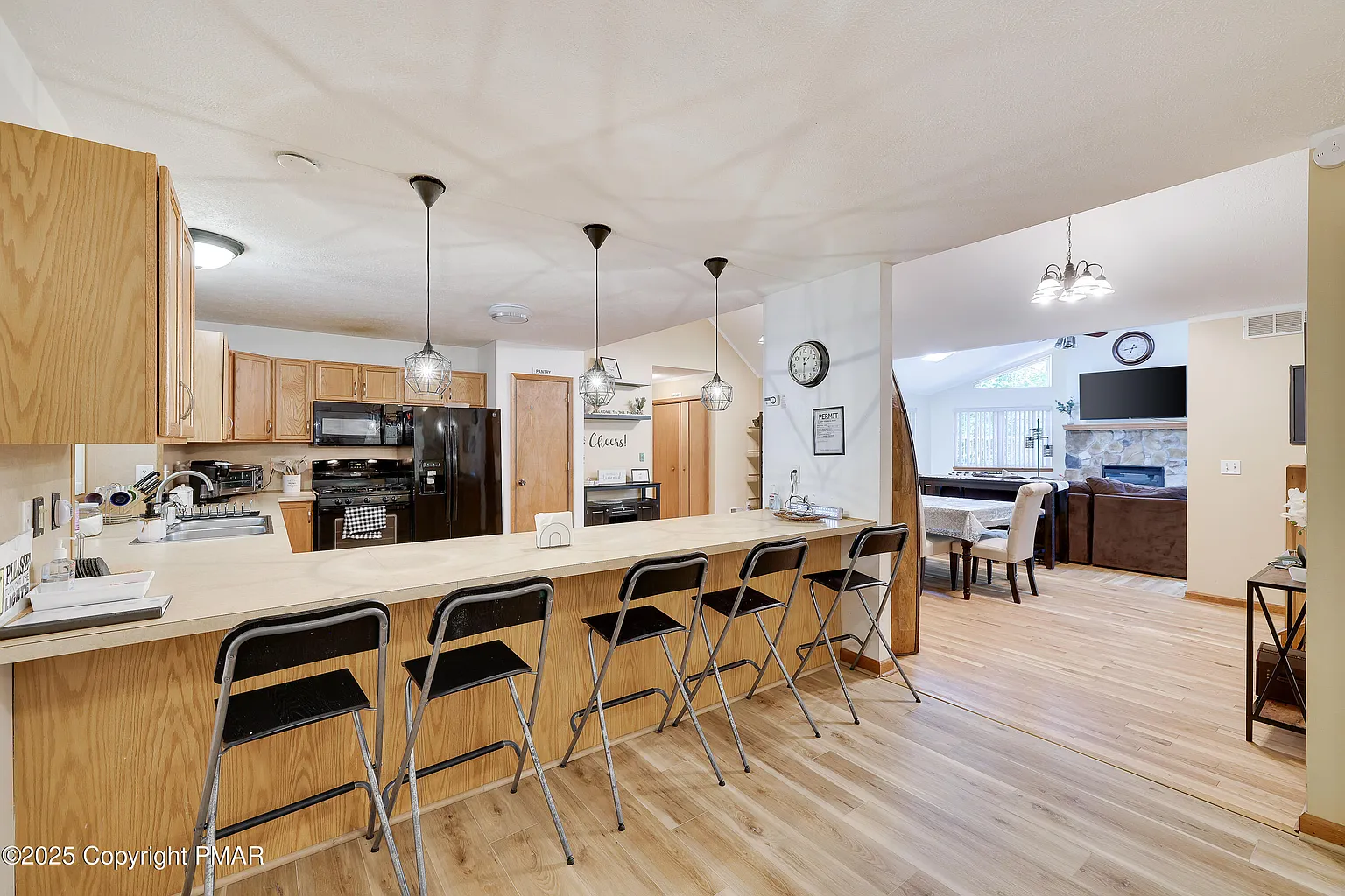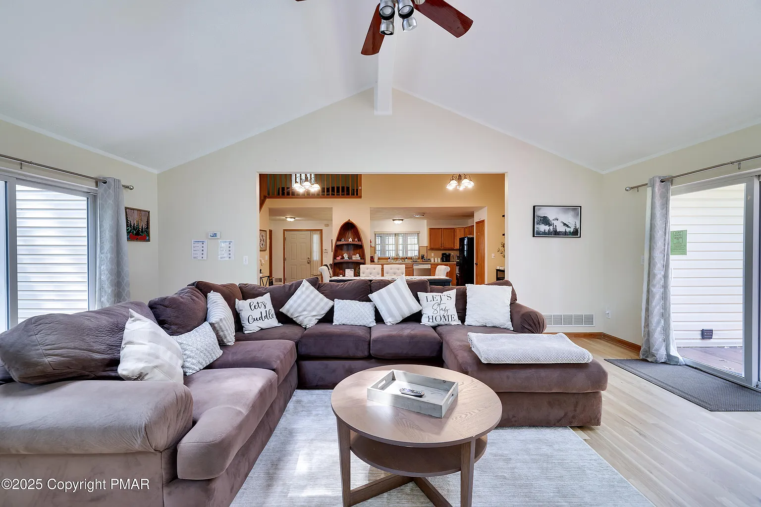 Huge family room with vaulted ceilings & stunning fireplace